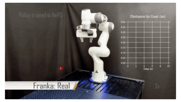 我们在 7 自由度 Franka 机械臂上验证了 NeRD 模型的准确性,基于完全在集成 NeRD 的仿真器中训练的目标位姿(到达)策略,实现了零样本仿真到现实的迁移(图 7)。