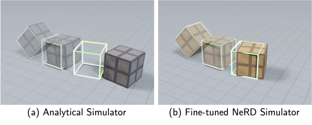 NeRD 模型固有的可微性使其能通过真实世界数据快速微调。我们使用真实世界的抛立方体数据集,对预训练的 NeRD 模型进行抛立方体任务微调。结果显示,微调后的 NeRD 模型动力学准确性显著优于解析仿真器(如图 8 所示)。