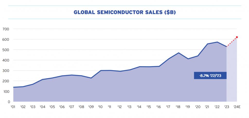 半导体行业协会(SIA)发布了一份报告,其中显示2023年全球半导体销售额达到了5270亿美元,销售了近1万亿块半导体,全球人均购买量超过了100颗芯片。同时预估2024年,销售额将超过6000亿。