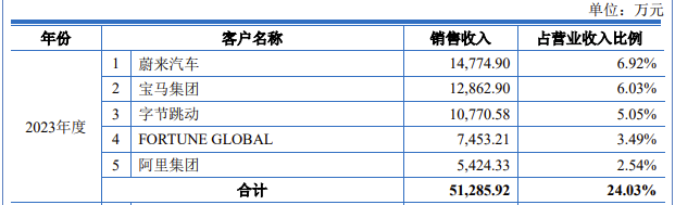 昆仑联通在招股书中表示,报告期内,公司累计服务客户数量超过 4,500 家,覆盖制造、互联网、金融等行业,其中包括戴尔、新华三、浪潮、宝马、大众、蔚来、特斯拉、字节跳动、京东、百度、阿里、利星行等国内外知名企业。在2023年,蔚来汽车、宝马集团、字节跳动、FORTUNE GLOBAL、阿里集团是其五大客户,总计带来占24.03%的营业收入比例。