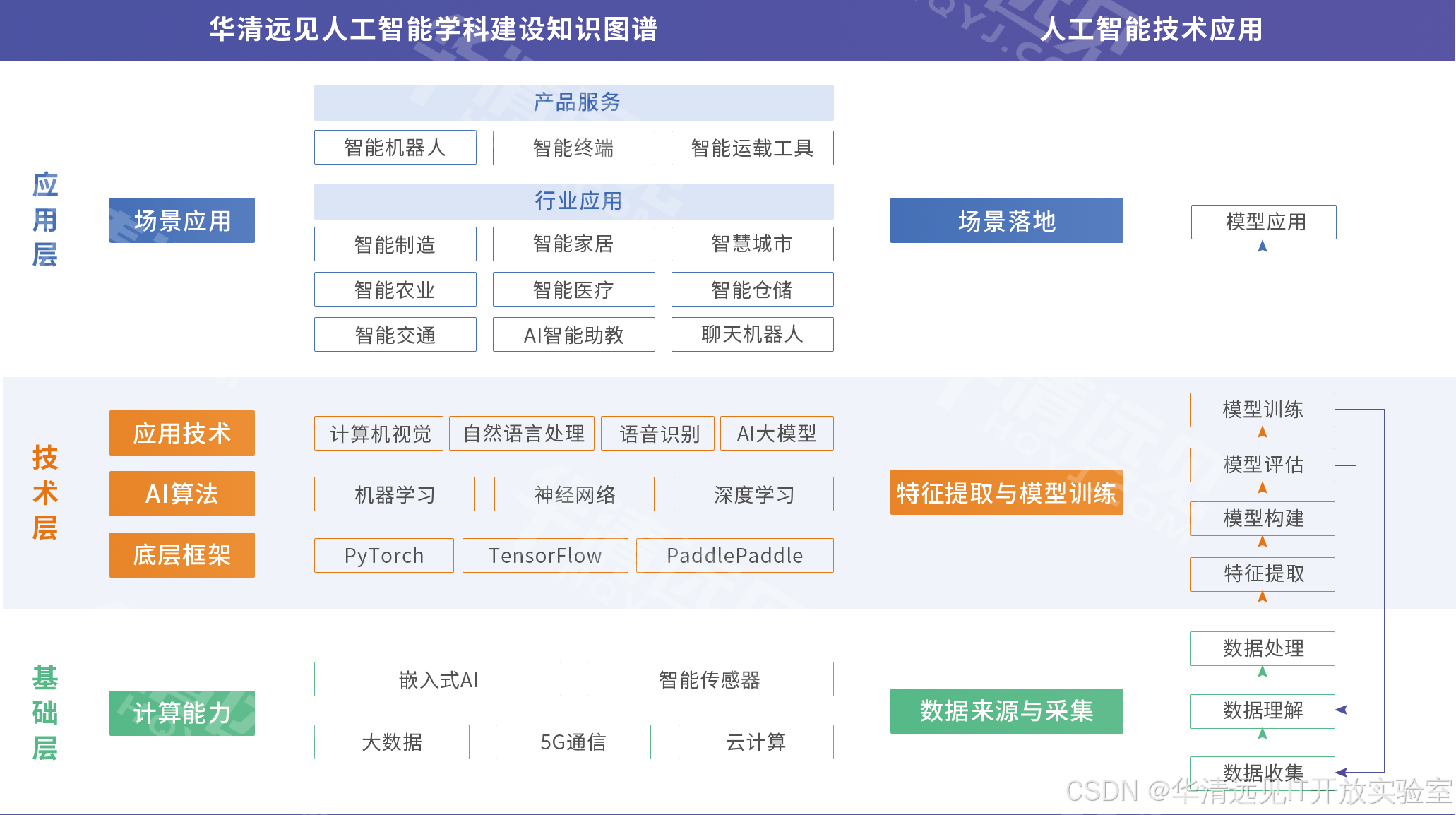 可见人工智能是个广义的学科,涉及基础层、技术层、应用层的技术,它们共同构成了人工智能的全貌。人工智能的学习,核心是技术层和应用层的学习,技术层核心学习的是各类AI算法,应用层更多的是实战算法的应用。