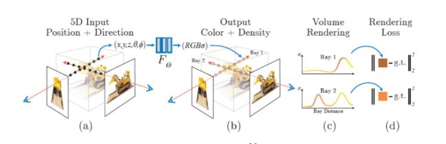 1. 对于给定的相机光线,在光线上进行采样,对采样点的空间坐标及观察方向进行编码,用深度复杂网络存获得辐射场信息;