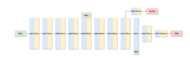 下图表示了辐射场的网络结构,其中PE表示位置编码,x为三维坐标点,d为观察方向,MLP为多层感知机,ReLU和Sigmoid分别为不同激活函数。辐射场网络的输入是空间坐标及方差方向,输出为对应的颜色和密度值传递至体渲染模块。