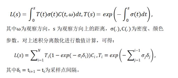 体渲染主要为解决云、烟、果冻等非刚性物体进行渲染建模,将其抽象成一团粒子群,表现了光线穿过时光子和粒子交互的过程,产生的辐亮度的变化。其物理过程包括吸收、外散射、内散射、放射。忽略背景光的影响,体渲染方程为: