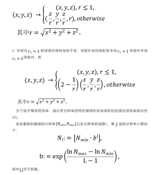 对于无边界场景,由于可视范围变大的原因通过NDC坐标变化后的采样过程会将近景采样稀疏化,影响最终成像质量导致物体模糊,保持近距离坐标不变,远距离坐标作非线性转换是一种解决思路。坐标转换形式包括了[2-3]: