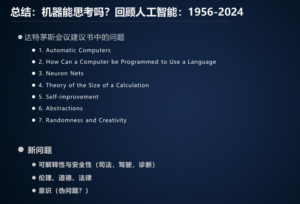 张晓东在演讲最后还提到了1956年达特茅斯会议问的七个问题,每个问题我们都得到了巨大的进展,但是都每一个问题都没有完美的回答。现在又面临着几个新问题,例如AI现实中遇到了司法、伦理道德和AI自主意识。