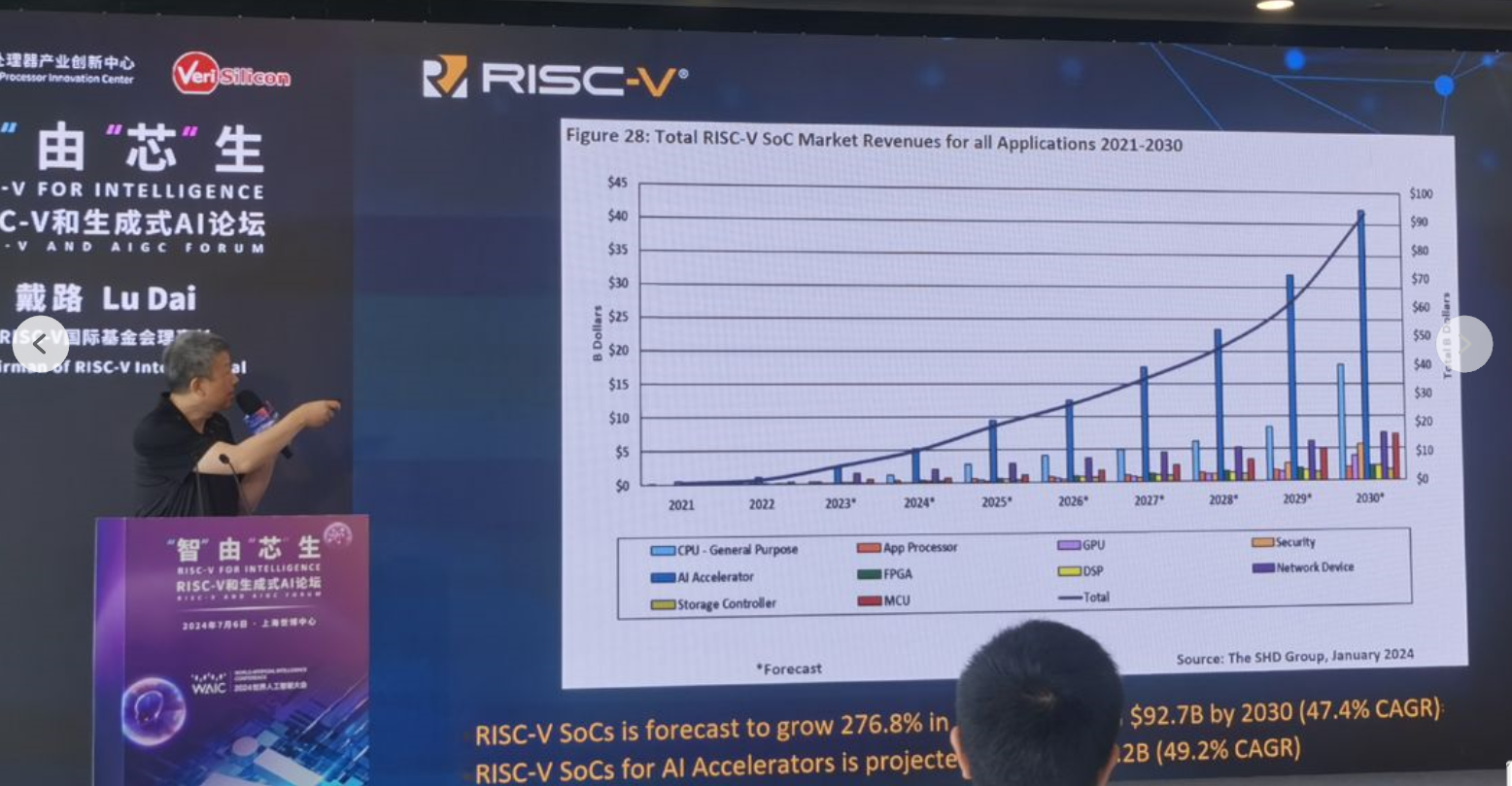 RISC-V国际基金会理事长戴路也在论坛上作了“RISC-V是AI的首选”的主题演讲。RISC-V的开源性,对于基础驾构兼容的模组化IP和客制化设计,让RISC-V取得了非常快速的扩张与增长。
