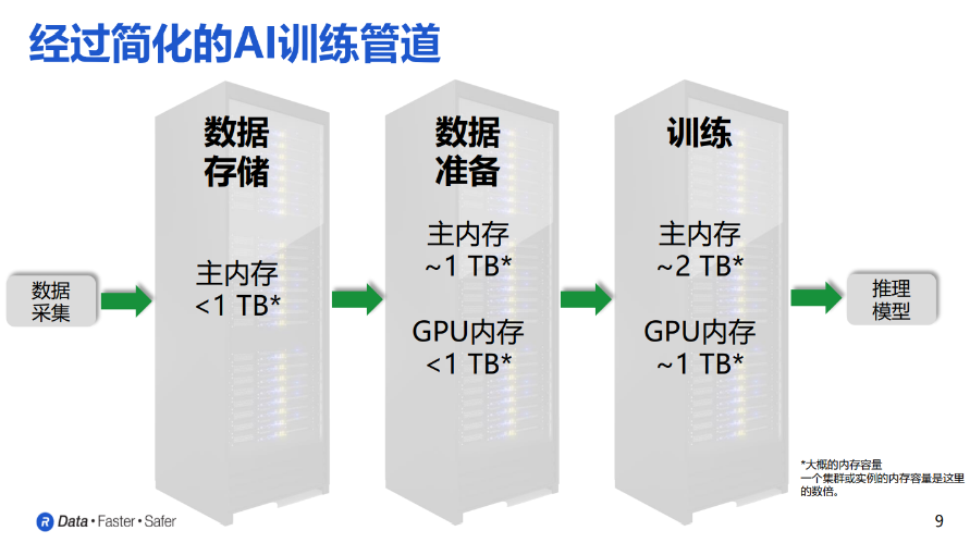 以经过简化的AI训练管道流程来看,在数据采集进来后的数据存储阶段对主内存的需求以小于1TB来计算(实际应用中一个集群或实例的内存容量会是简化模型的数倍。),这时GPU还无须参与训练中。