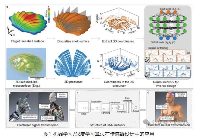 机器学习/深度学习主要通过两个方面辅助传感器设计。首先,开发了如人工神经网络等逆向工程模型,以根据所需性能结果来设计目标传感器的几何架构。其次,在设计过程中,利用卷积神经网络(CNN)等算法优化传感器性能,解决诸如测量范围小、信噪比低以及精度不足等问题。