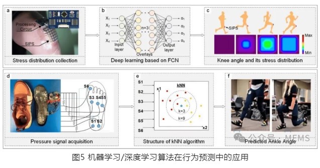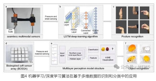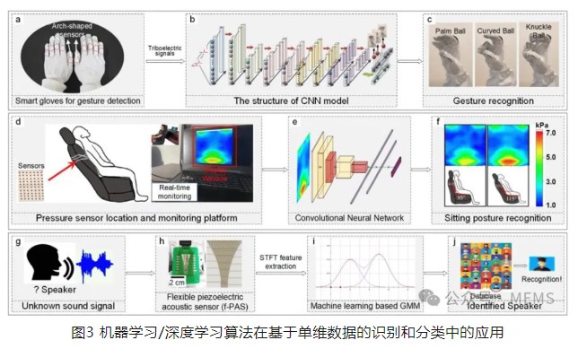 在传感器应用中,人工智能不仅仅局限于信号收集,还能够对目标和应用场景进行识别和分类。人工智能辅助识别和分类流程通常包括传感器的数据收集、特征提取、特征匹配和识别。通过采用随机森林(RF)、K-最近邻(KNN)、支持向量机(SVM)和深度信念网络(DBN)等算法,可以缩短识别中的决策时间,提高准确性,降低人工识别成本,并且最大限度地减少环境干扰,从而实现更精确的特征提取。应用场景的复杂性决定了对传感器信息的需求;例如,语音识别可以仅通过振动信号实现,而运动识别通常需要结合视觉和压力传感器的信号。