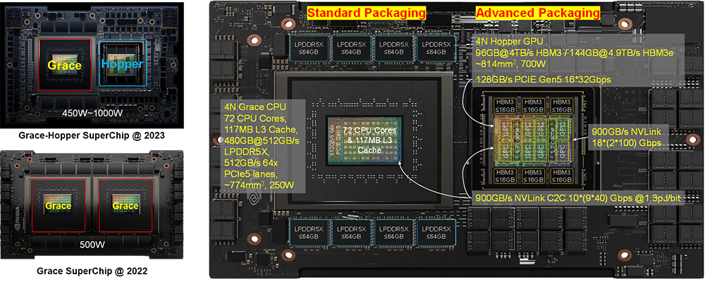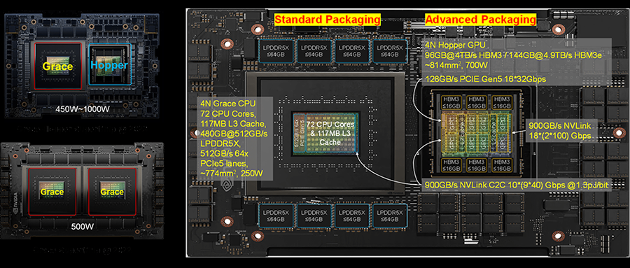 从成本角度来看,NVLink C2C的面积和功耗优于SerDes互联。因此,在提供相同互联带宽的情况下,它可以节省更多的芯片面积用于计算和缓存。然而,考虑到计算芯片并不是IO密集型芯片,因此这种成本节约的比例并不显著。但是,如果将双Chiplet芯粒拼装成更大规模的芯片时,NVLink C2C可以在某些场景下可以避免先进封装的使用,这对降低芯片成本有明显的帮助,例如Grace CPU SuperChip超级芯片选择标准封装加上NVLink C2C互联的方式进行扩展可以降低成本。在当前工艺水平下,先进封装的成本远高于逻辑Die本身。