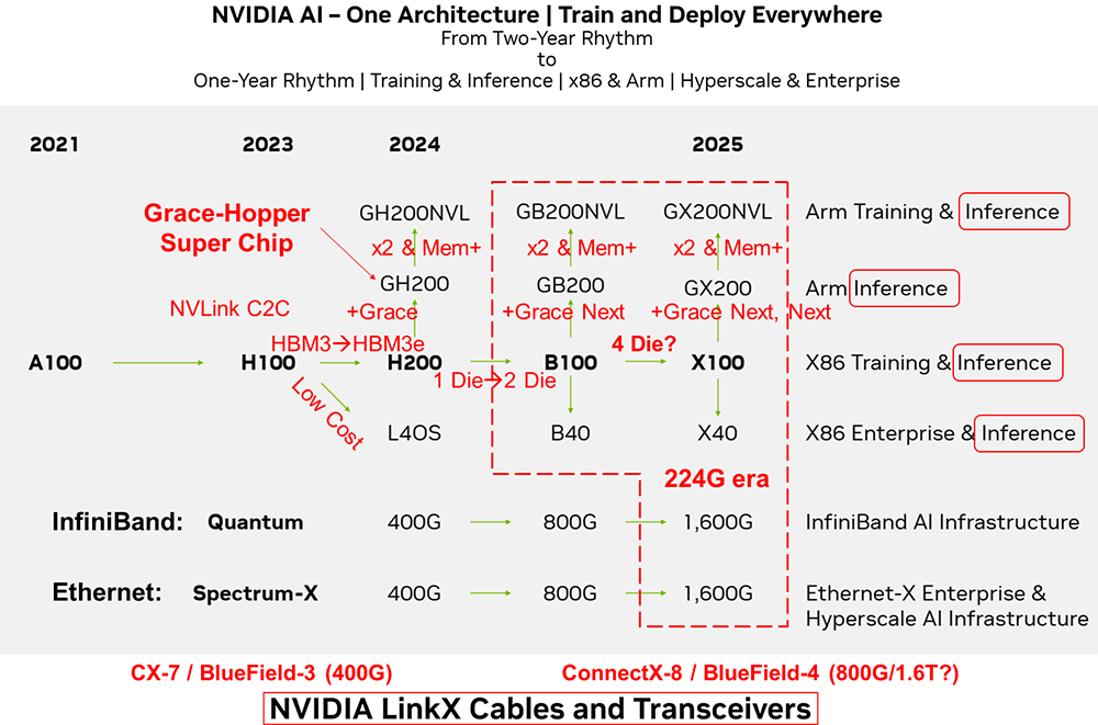 在交换芯片方面,仍然坚持InfiniBand和Ethernet两条开放路线,瞄准不同市场,前者瞄准AI Factory,后者瞄准AIGC Cloud。但其并未给出NVLink和NVSwitch自有生态的明确计划。224G代际的速度提升,可能率先NVLink和NVSwitch上落地。