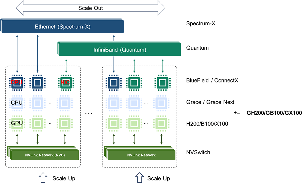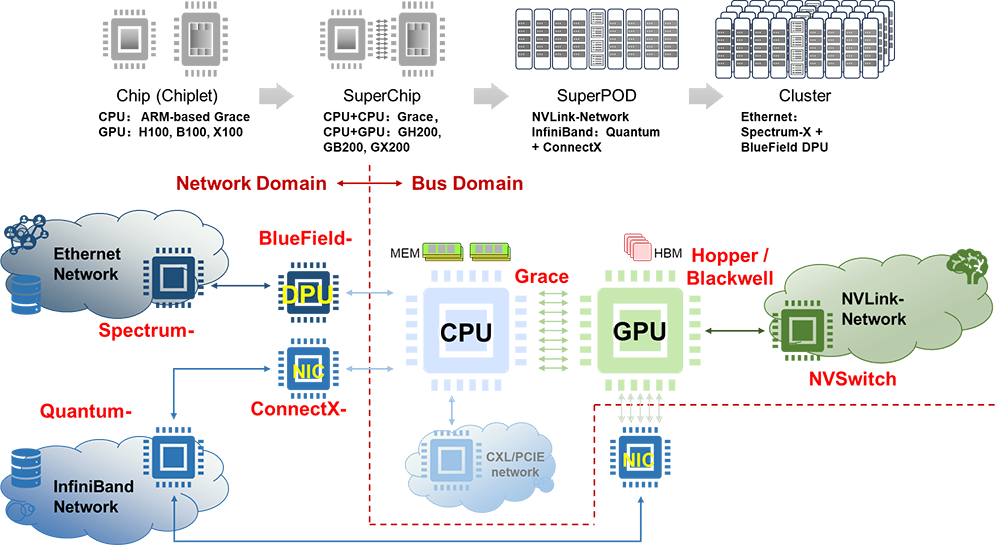 NVIDIA布局了两种类型网络,一种是传统InfiniBand和Ethernet网络,另一种是NVLink总线域网络。