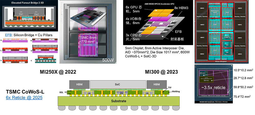 TSMC的CoWoS先进封装工艺封装基板的尺寸在2023年为4倍Reticle面积,2025年将达到6倍Reticle面积 [19]。当前NVIDIA H100 GPU的封装基板尺寸小于2倍Reticle面积,AMD的MI300系列GPU的封装基板尺寸大约为3.5倍Reticle面积,逼近当前TSMC CoWoS-L工艺的极限。