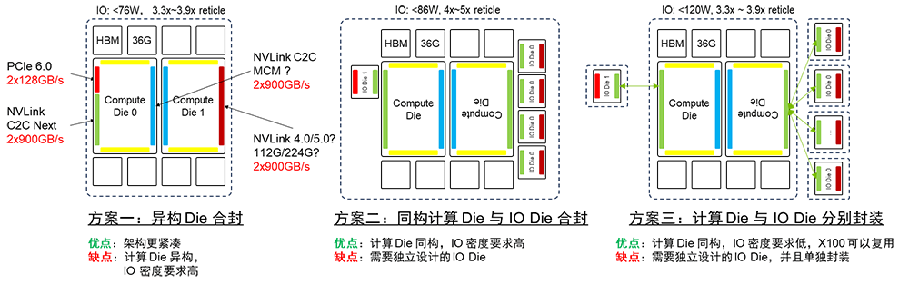 在满足2025年的工程约束的前提下,X100也可以采用SuperChip超级芯片架构在B100双Die架构的基础上进行平面扩展。在这种情况下,NVIDIA X100也有“异构Die合封”,“同构计算Die与IO Die合封”,“计算Die与IO Die分别封装”三种架构选项。如果采用封装间互联的超级芯片的扩展方式,先进封装的基板面积约束将不再会是瓶颈,此时只需要增强NVLink C2C的驱动能力。