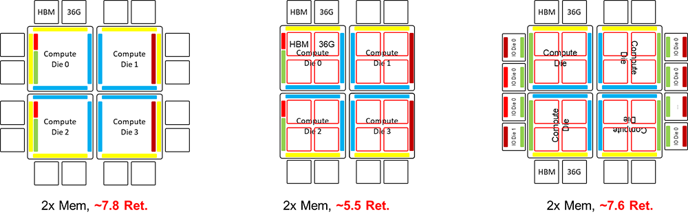 为了实现计算Die的归一化,可以将IO从计算Die中分离出来,形成独立的IO Die。这样,计算Die的互联接口就实现了归一化,使计算Die具备了旋转对称性。 在这种情况下,仍然存在两种架构:一种是同构计算Die与IO Die合封,另一种是计算Die与IO Die分别封装并用C2C互联将二者连接。计算Die的同构最大的优势在于可以实现芯片的系列化。通过灵活组合计算Die和IO Die,可以实现不同规格的芯片以适应不同的应用场景的需求。