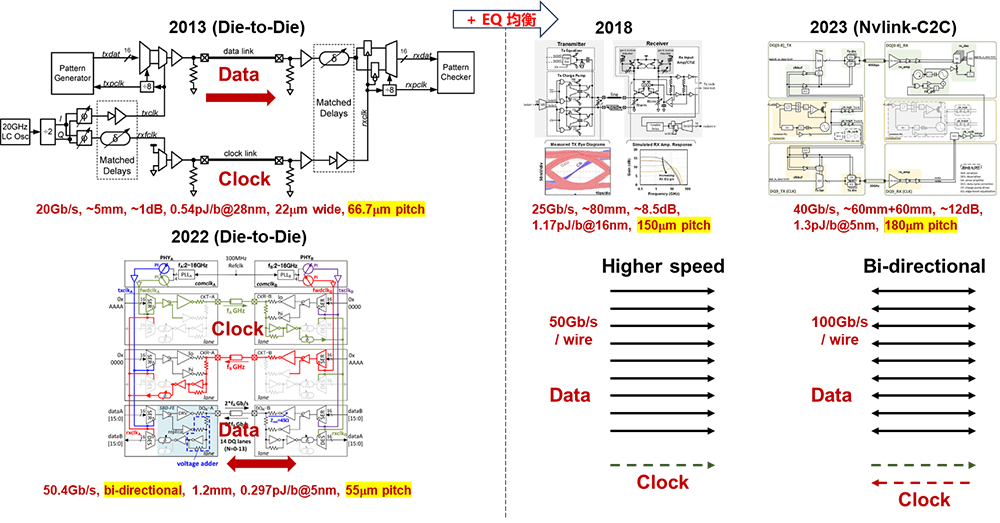 基于NVLink C2C的产品目前只有GH200这一代,但是从NVIDIA在该领域公开发表的论文中可以大致看出其技术发展的脉络。从技术演进上看,它是封装内Die间互联的在均衡上的增强。从NVIDIA SuperChip超级芯片路标来看,它将在未来的AI芯片中继续发挥重要作用。对于这类接口,仍需保持连接两个独立封装芯片的能力和极低的时延和功耗。