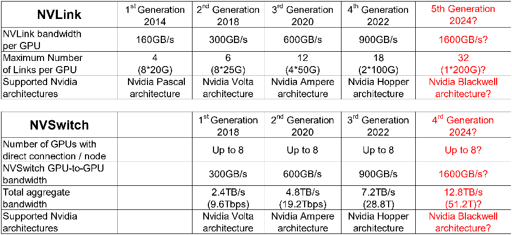 值得注意的是,除了NVLink 1.0采用了20G特殊速率点以外,NVLink 2.0~4.0皆采用了与Ethernet相同或者相近的频点,这样做的好处是可以复用成熟的Ethernet互联生态,也为未来实现连接盒子或机框组成超节点埋下伏笔。