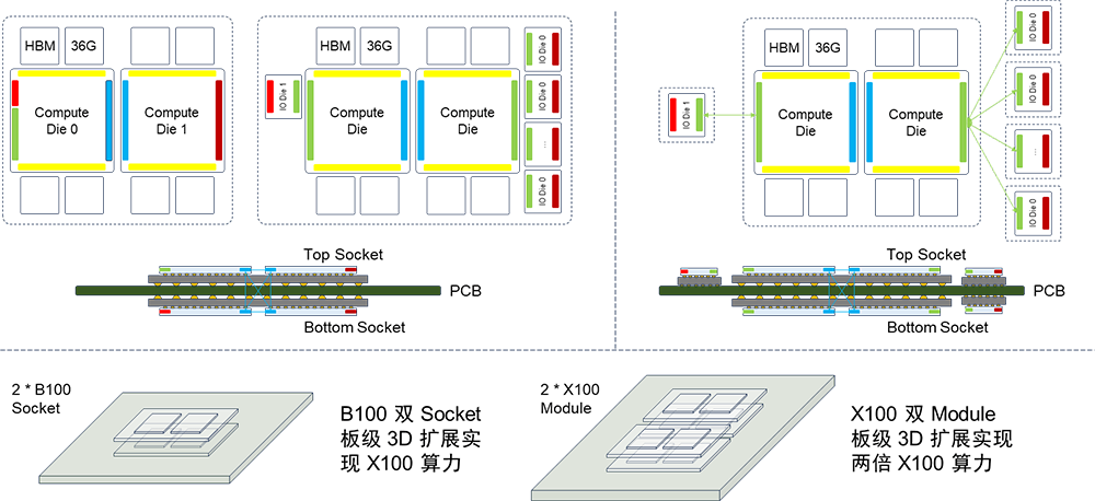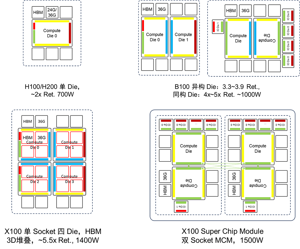 2. B100将采用双Die架构。如果采用异构Die合封方式,封装基板面积将小于当前先进封装4倍Reticle面积的约束。而如果采用计算Die和IO Die分离,同构计算Die和IO Die合封的方式,封装基板面积将超出当前先进封装4倍Reticle面积的约束。如果采用计算Die和IO Die分离,同构计算Die和IO Die分开封装的方式,则可以满足当前的工程工艺约束。考虑到B100 2024年推出的节奏,以及计算Die在整个GPU芯片中的成本占比并不高,因此用异构Die合封方式的可能性较大。 3. 如果X100采用单Socket封装,四个异构Die合封装的方式,需要在计算Die上堆叠HBM,同时需要先进封装的基板达到6倍Reticle面积。但是,如果采用SuperChip超级芯片的方式组成双Socket封装模组,可以避免计算Die上堆叠HBM,并放松对先进封装基板面积的要求,此时需要对NVLink C2C的驱动能力做增强。