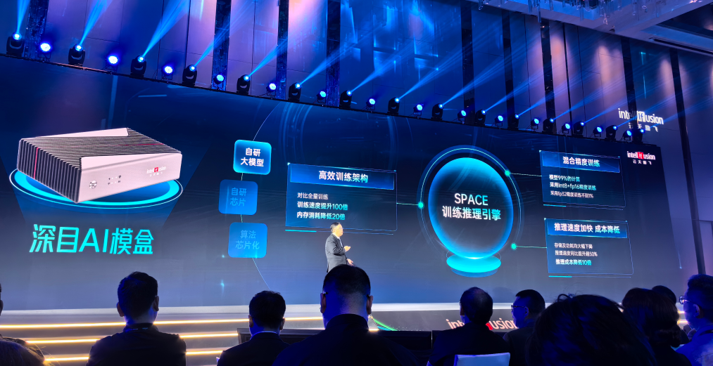 根据介绍,基于SPACE训练推理引擎的高效训练架构,对比全量训练,“深目”AI模盒训练速度提升100倍,内存消耗降低20倍。通过混合精度训练,模型99%的计算采用int8+fP16精度训练,只有不到1%的计算才用得fp32精度训练。而且做到了存储及功耗均大幅下降,推理速度同比提升50%,推理成本更是降低10倍。