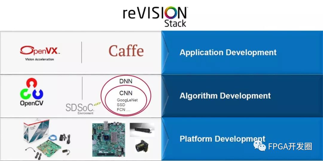 使用赛灵思提供的 reVISION™ 堆栈,在异构 SoC 中能轻松实现图像处理算法和机器学习网络。基于 SDSoC™ 工具,reVISION 能同时支持传统图像应用和机器学习应用。在 reVISION 内部,同时支持 OpenVX 和 Caffe 框架。为支持 OpenVX 框架,内核图像处理功能可被加速到可编程逻辑中,以创建图像处理流水线。同时机器学习推断环境支持可编程逻辑中的硬件优化库,以实现执行机器学习实现方案的推断引擎。