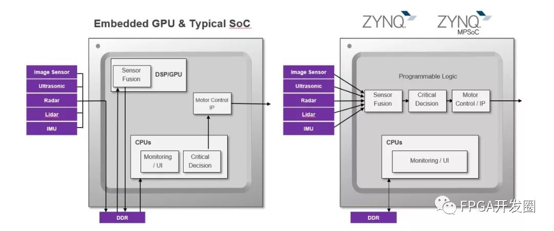 实现嵌入式视觉和机器学习基于可编程逻辑的解决方案,例如异构赛灵思 All Programmable Zynq® -7000 SoC(片上系统)和 Zynq® UltraScale+™ MPSoC 等多处理器片上系统 (MPSoC) 越来越广泛地用于嵌入式视觉应用。这些器件将可编程逻辑 (PL) 架构与处理系统 (PS) 中的高性能ARM® 内核完美组合在一起。这种组合形成的系统拥有更快的响应速度,极为灵活便于未来修改,并且提供了高能效解决方案。对许多应用来说低时延决策与响应循环极为重要。例如视觉引导自主机器人,响应时间对避免给人员造成伤害、给环境造成破坏至关重要。缩短响应时间的具体方法是使用可编程逻辑实现视觉处理流水线和使用机器学习推断引擎实现机器学习。在这方面使用可编程逻辑,与传统解决方案相比可减少系统瓶颈问题。在使用基于 CPU/GPU 的方法时,运算每一阶段都需要使用外部 DDR,因为图像不能在有限内部缓存内的功能间传递。可编程逻辑方法使用内部 ARM 按需提供缓存,允许采用流媒体方法。避免在 DDR 内存储中间元不仅可降低图像处理的时延,而且还能降低功耗,甚至提高确定性,因为无需与其他系统资源共享访问。