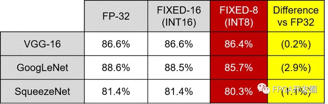 机器学习推断引擎实现方案中使用的数值表示系统也对机器学习性能有重要作用。机器学习应用正越来越多地使用更高效的降精度定点数值系统,例如 INT8 表达式。与传统的浮点 32 (FP32) 方法相比,使用定点降精度数值系统不会造成显著的精度下降。因为与浮点相比,定点数学在实现难度上也明显更低,转而采用 INT8 能在一些实现中提供更高效、更快速的解决方案。使用定点数值系统对在可编程逻辑解决方案中的实现方案而言相当理想,reVISION 在可编程逻辑中能与 INT8 表达式协同工作。这些 INT8 表达式方便在可编程逻辑中使用专门的 DSP 模块。在使用相同的内核权重时,这些 DSP 模块架构能实现最多两个并发 INT8 乘法累加运算供执行。这样不仅能提供高性能实现方案,而且还能够降低功耗。只要采用,可编程逻辑的灵活性也还便于实现进一步降精度定点数值表达系统。