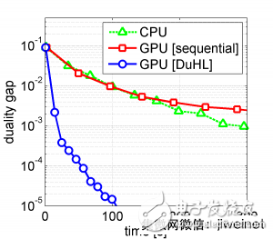 (上图)图中显示了三种算法所需的时间,包含DuHL在大规模的支持向量机的表现,所使用的数据集都为30GB的ImageNet数据库,硬件为内存8GB的NVIDIA Quadro M4000 GPU, 图中可以发现GPU序列批次的效率,甚至比单纯CPU的方法还要糟,而DuHL的速度为其他两种方法的10倍以上。