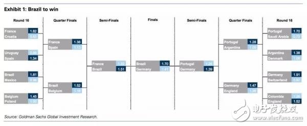 高盛采用人工智能技术,综合每个球队的小组表现,球员的个人表现,往年世界杯战绩等综合信息,利用4个机器学习模型将这些数据与2005年以来的世界杯和欧洲杯比赛得分进行对比,然后,他们还对世界杯进行了100万次模拟,最终预测结果显示,法国、巴西、葡萄牙和德国将打入半决赛,巴西最终将在决赛中击败德国。