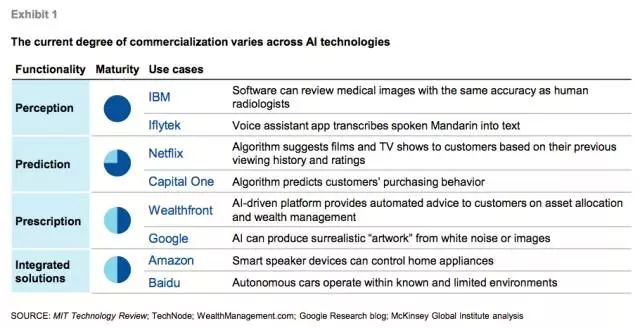 图1:AI 技术当下的商业化,麦肯锡认为,IBM 和讯飞的商业应用属于感知技术。而百度和亚马逊则是结合硬件的解决方案。