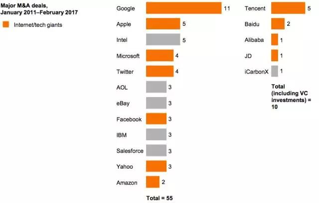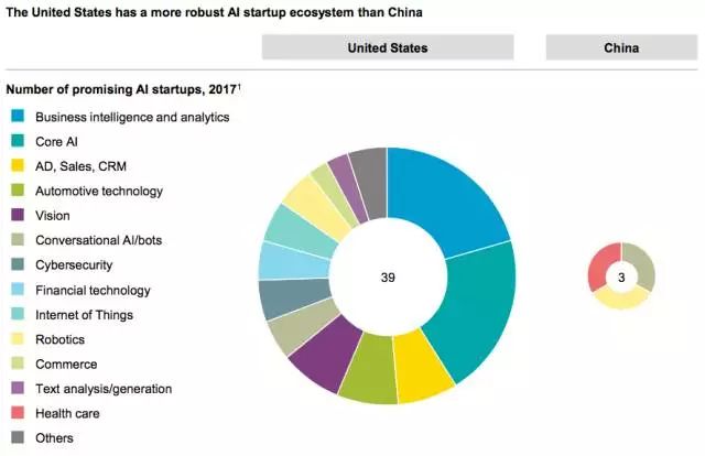 表3:美国的 AI 创业生态系统比中国更强大。上图显示中国和美国在50家最大(按总融资额排名)AI 创业公司中的占比,数据来自 CB Insight 发表的 AI 100 榜单。via: CB Insights; McKinsey analysis
