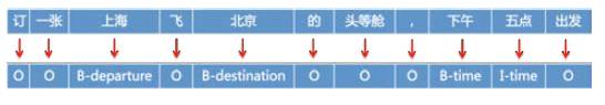 属性抽取问题可以抽象为一个序列标注问题,可以以字为单位进行序列标注,也可以以词为单位进行序列标注,如图 8 所示为以词为单位进行序列标注的示例。在这个例子中包含 departure、destination 和 time 三个待标注标签;B 表示一个待标注标签的起始词;I 表示一个待标注标签的非起始词,O 表示非待标注标签词。