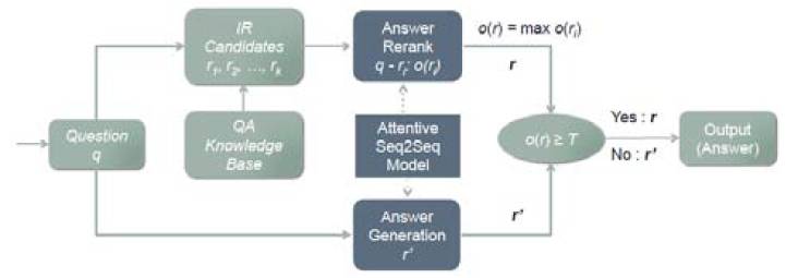 在我们的聊天引擎中,结合检索模型和生成模型各自的优势,提出了一种新的模型 AliMe Chat [23],基本流程如图 13 所示。首先采用检索模型从 QA 知识库中找出候选答案集合; 然后利用带注意力的 Seq2Seq 模型对候选答案进行排序,如果第一候选的得分超过某个阈值,则作为最终答案输出,否则利用生成模型生成答案。其中带注意力的 Seq2Seq 模型结构如图 14 所示。经过训练后,主要做了如下测试:如图 15 所示,利用 600 个问题的测试集,测试了检索(IR)、生成(Generation)、检索+ 重排序(Rerank)及检索+ 重排序+ 生成(IR+Rerank+Generation)四种方法的效果,可以看到在阈值为 0.19 时,IR+Rerank+Generation 的方法效果最好。