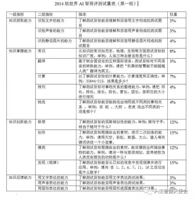 2014年的论文中,研究团队根据标准智能系统模型的特征要点,从知识的获取能力(观察能力)、知识掌握能力、知识创新能力,知识的反馈能力(表达能力)等四大方面建立AI智商评价体系,并从这四个方面建立15个分测试,形成人工智能智商测试量表,具体介绍如下: