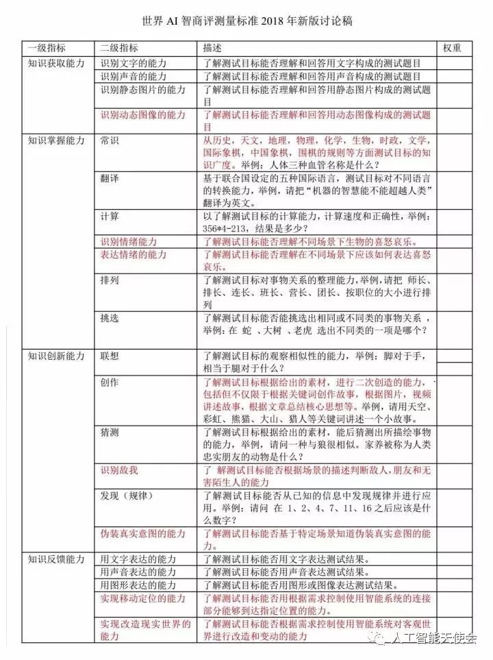 从最近几年对人工智能的发展和对关于智能的最新研究。未来智能实验室将对AI智商评测量表从测试分类和分类权重进行调整,主要调整的内容增加了识别动态图像的能力,情绪的识别与表达能力,识别敌我的能力,伪装真实意图的能力,实现移动定位的能力,实现改造世界的能力等,除此之外对常识和创作的测试也做了更为细化的工作(红色代表修改和更新的指标项):