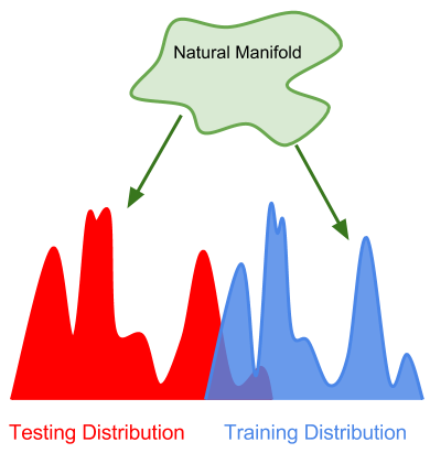在“强泛化”的测试中,模型在测试中使用的数据来自与训练数据完全不同的分布,但是,这些数据的底层manifold(或生成过程)是相同的。