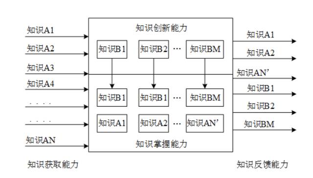 第三.具有生成新数据、信息和知识的能力,即基于自身拥有的知识,在新数据或信息的启发下,对数据、信息和知识进行创新从而产生新的数据、信息和知识的能力,如图1.4所示(为了简化,本图中数据、信息、知识统一用知识描述)。