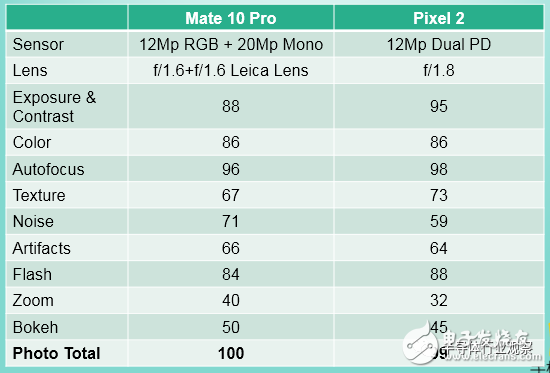 而在拍照(Photo)方面,华为Mate 10 Pro 超过了Pixel 2的99分,以100分的成绩傲视群雄。