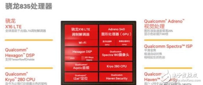 高通毫无疑问是移动端芯片的主导者。高通此次在CES上发布的产品主要是骁龙835 SoC。骁龙835 SoC使用三星10nm工艺制造,搭载了8核心Kyro 280处理器(包括峰值主频可达 2.45GHz 的 4 颗高性能核心,以及峰值主频可达 1.9GHz 的 4 颗低功耗核心)。