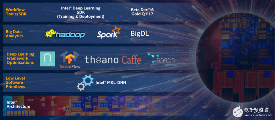 看好人工智能带来的运算处理需求与未来的蓬勃发展,英特尔不只是推出多种服务器端处理器来因应,在2016年11月举行的Intel AI Day活动期间,他们宣布将更积极发展深度学习应用的运算与沟通处理的链接库,并以基本指令(primitives)的形式整合到处理器硬件上。而在AI应用软件开发的支持上,他们陆续开始提供的部分,包含:链接库、程序语言的支持、平台、软件开发工具包、程序开发框架。