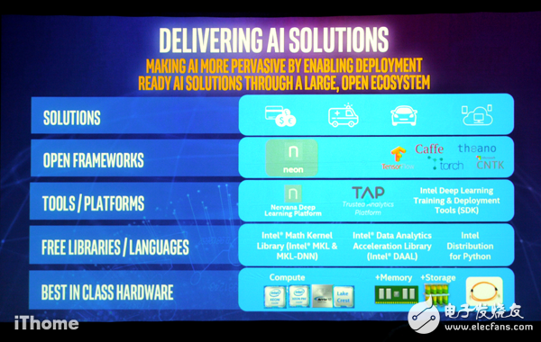 Neon是英特尔并购的Nervana Systems公司所发展出来的链接库,强调易用与高效能,在其现有的技术架构当中,可区分为深度学习功能(算法)、数据模型、解决方案等三层。