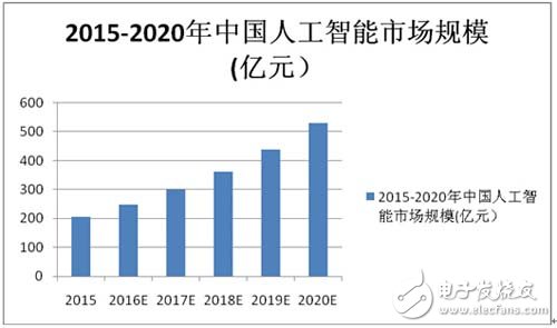 中国“十三五规划”的脑科学与类脑研究重大工程项目,将极大提升中国人工智能市场的供给质量,同时以百度为代表的互联网企业已经充分认识到人工智能的未来前景,纷纷开展大规模的投入和布局,也充分刺激了中国人工智能市场的活跃度。2015年中国人工智能市场规模到达203.9亿元,预计2020年将达到近530亿元,年复合增长率为21%。