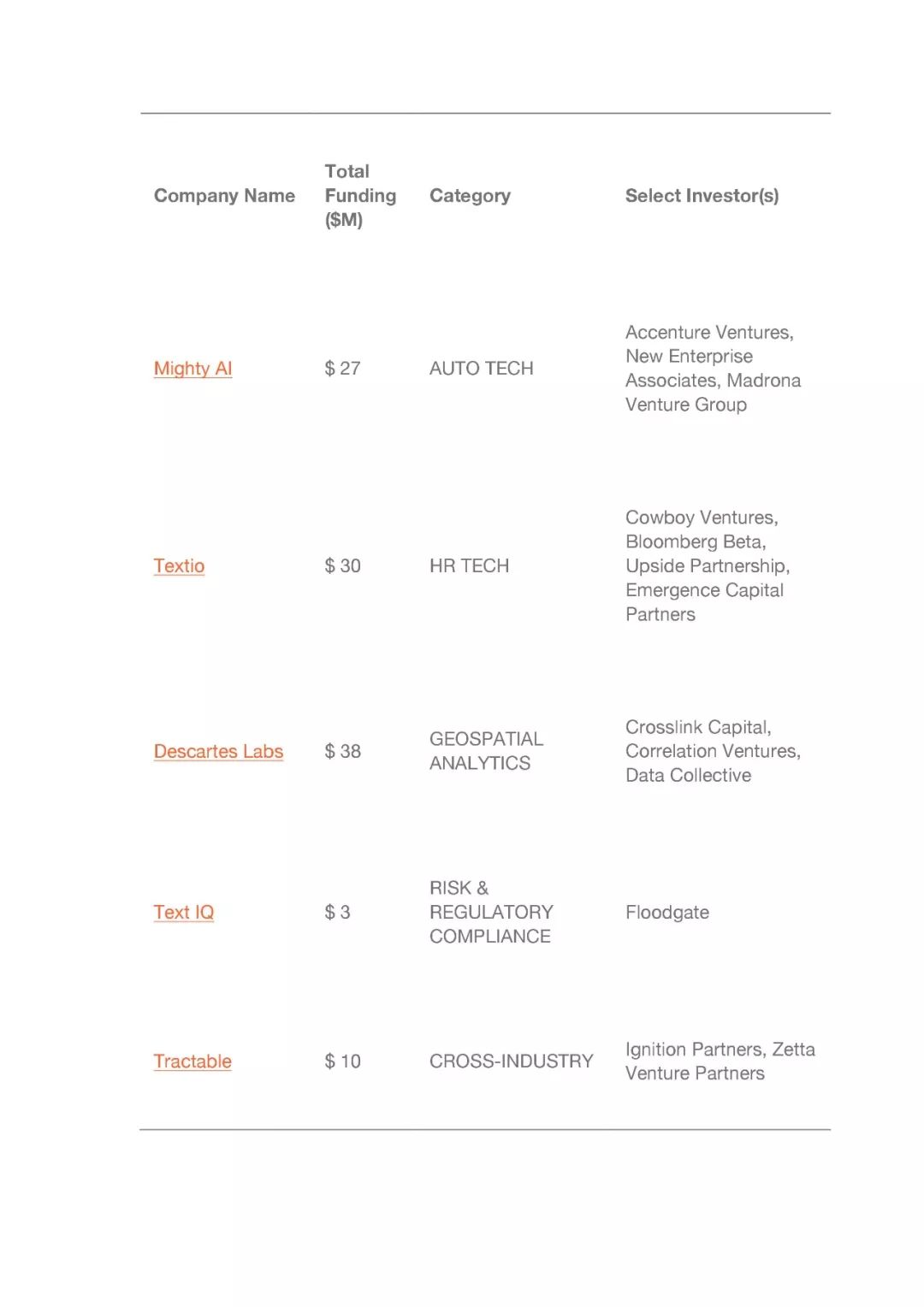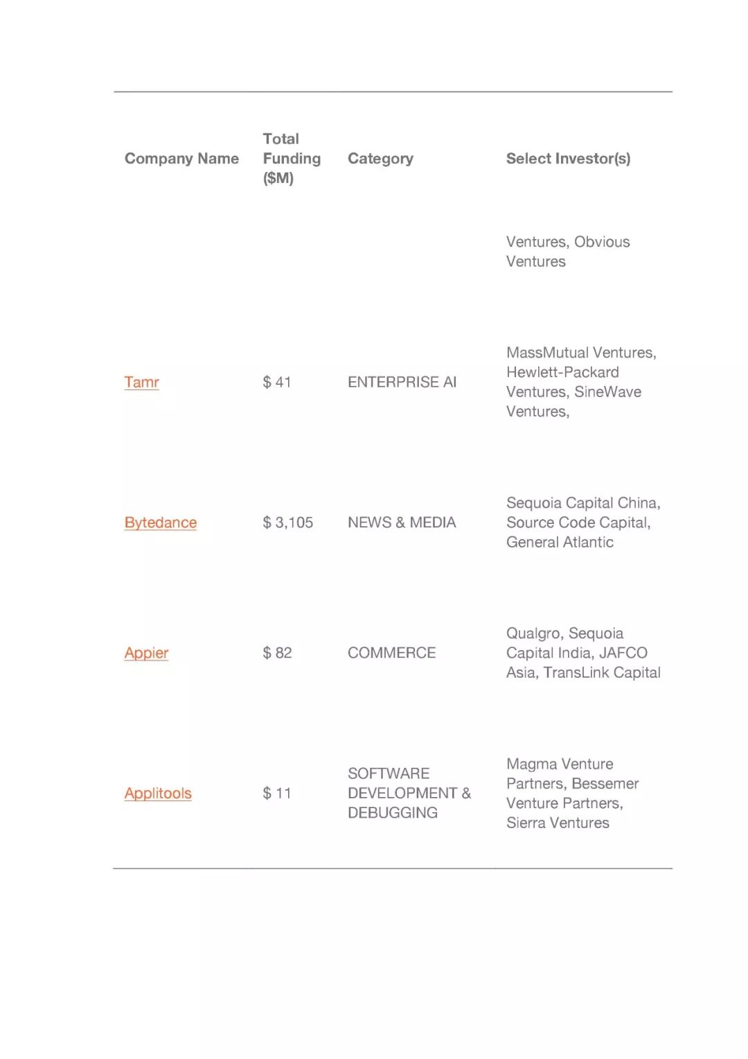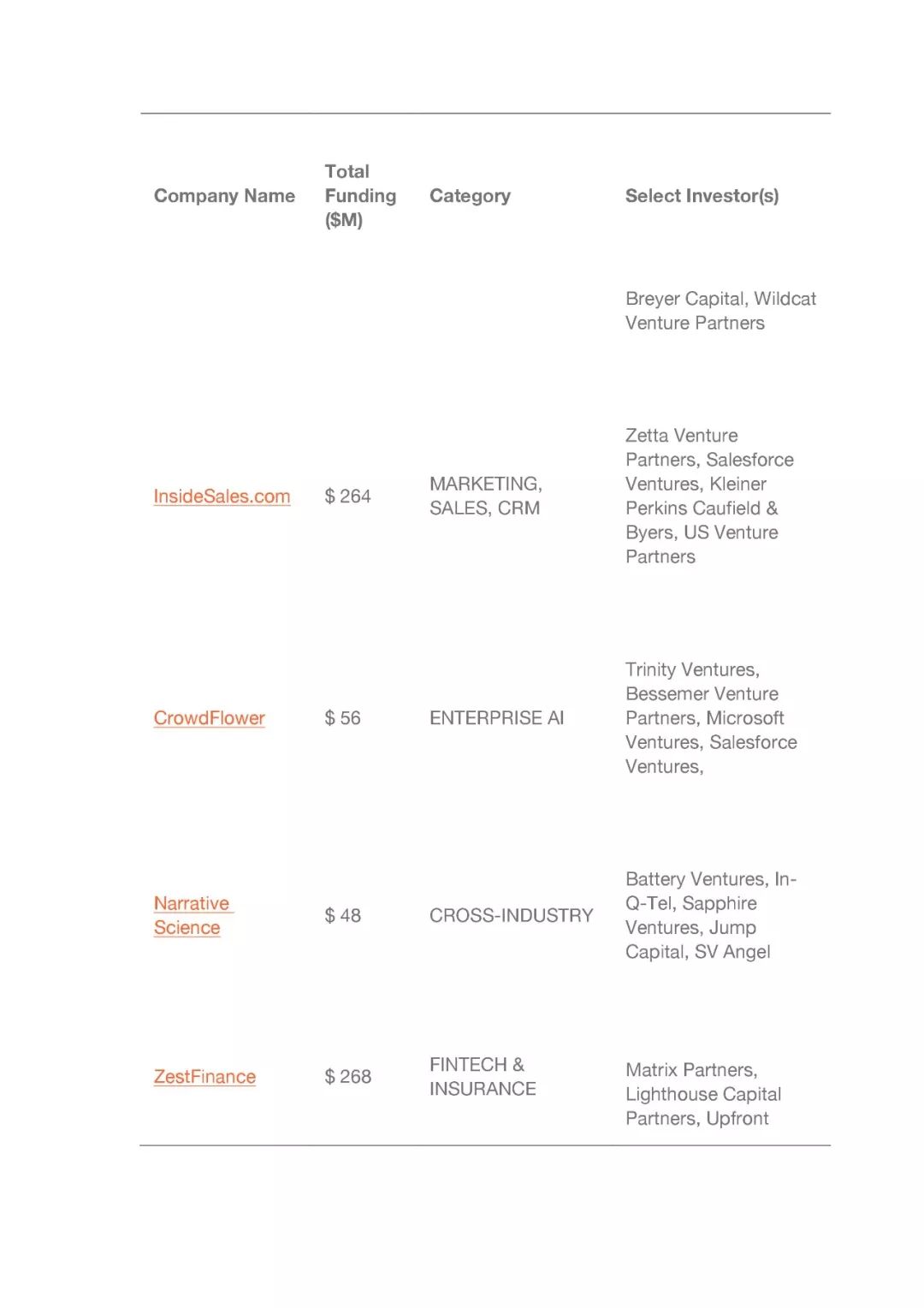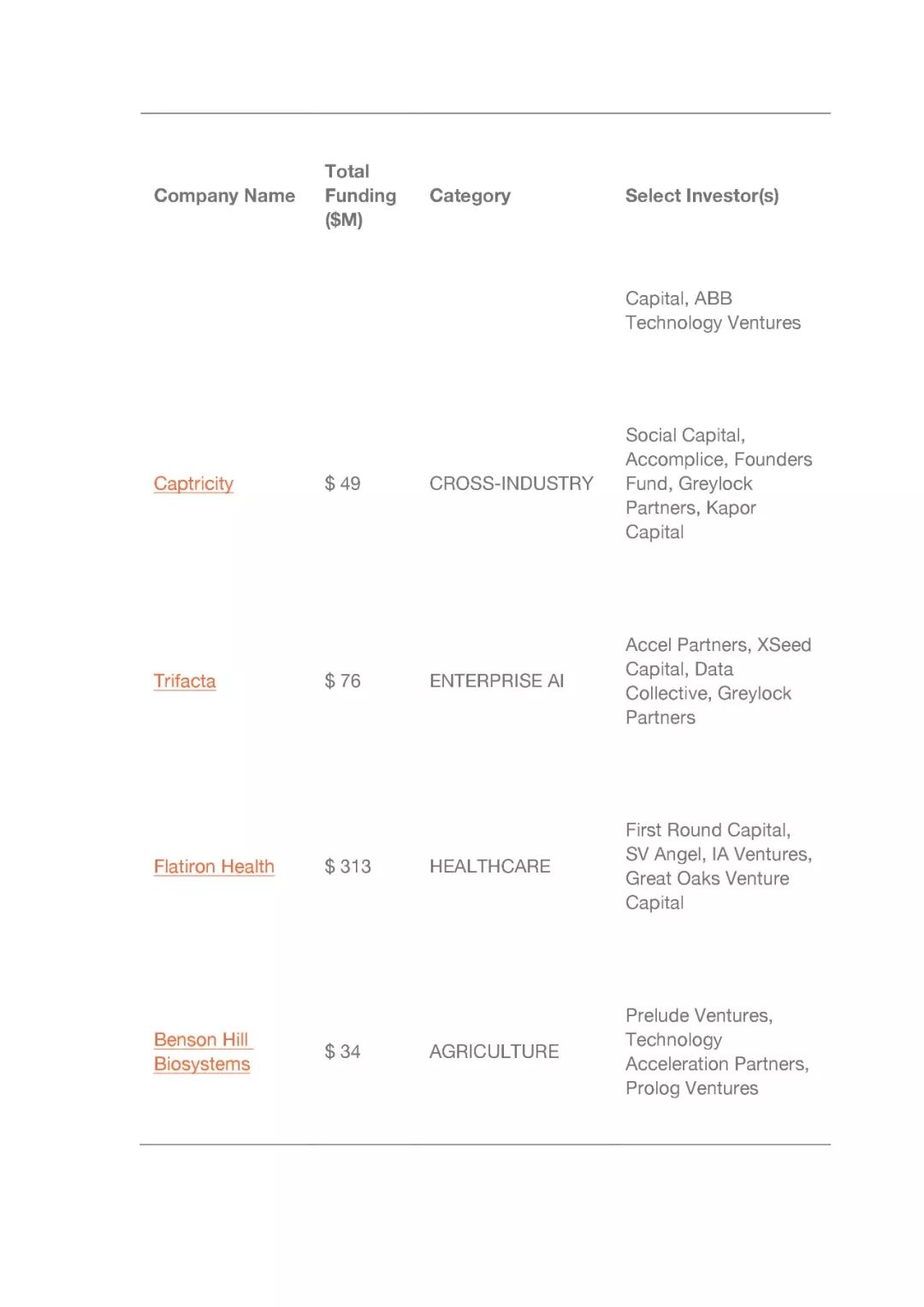 一些专注于行业内的特定用例的创业公司。例如AiCure专注于医药治疗,Gong专注于销售团队的电话分析以及Zest Finance专注于信用担保。