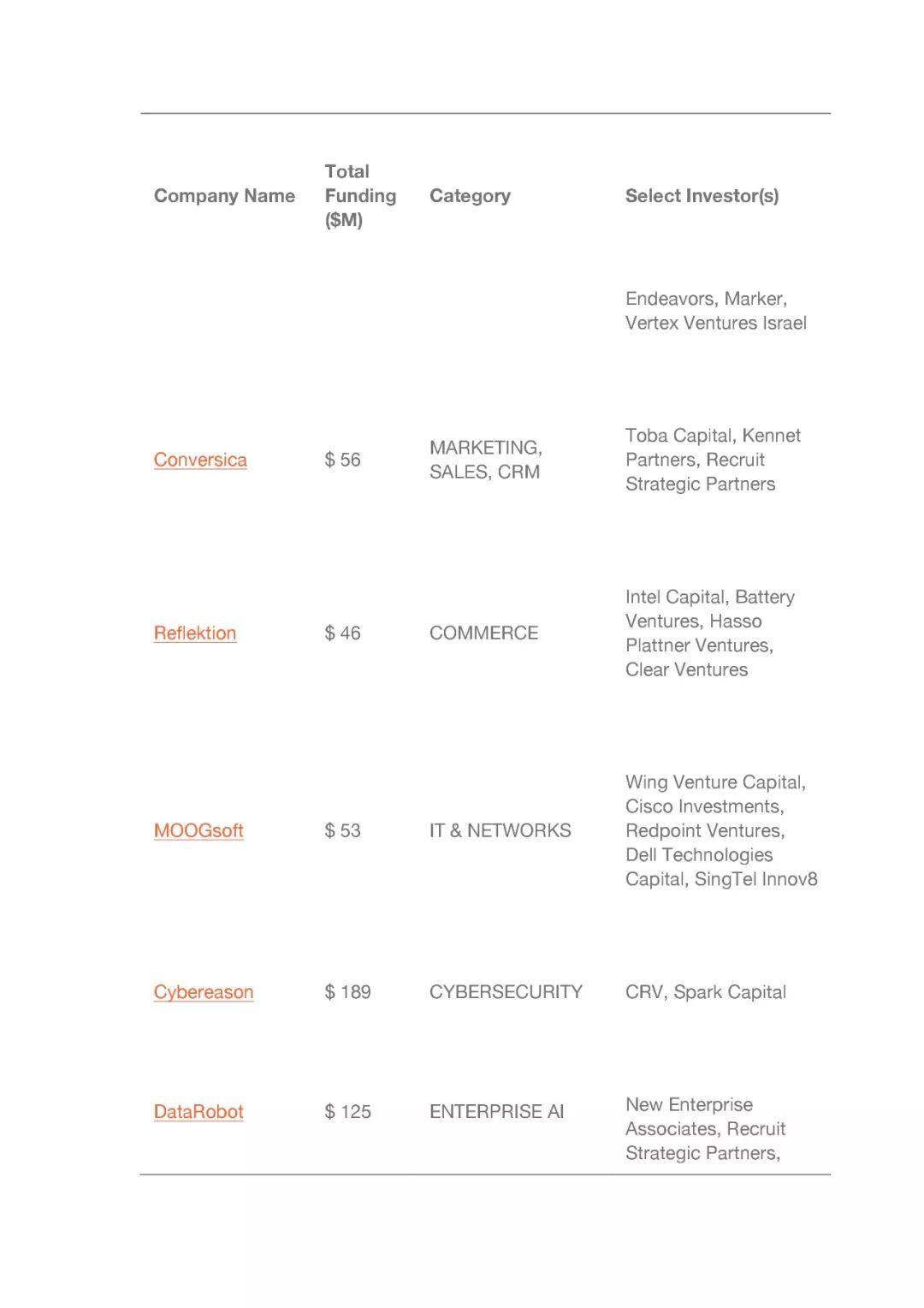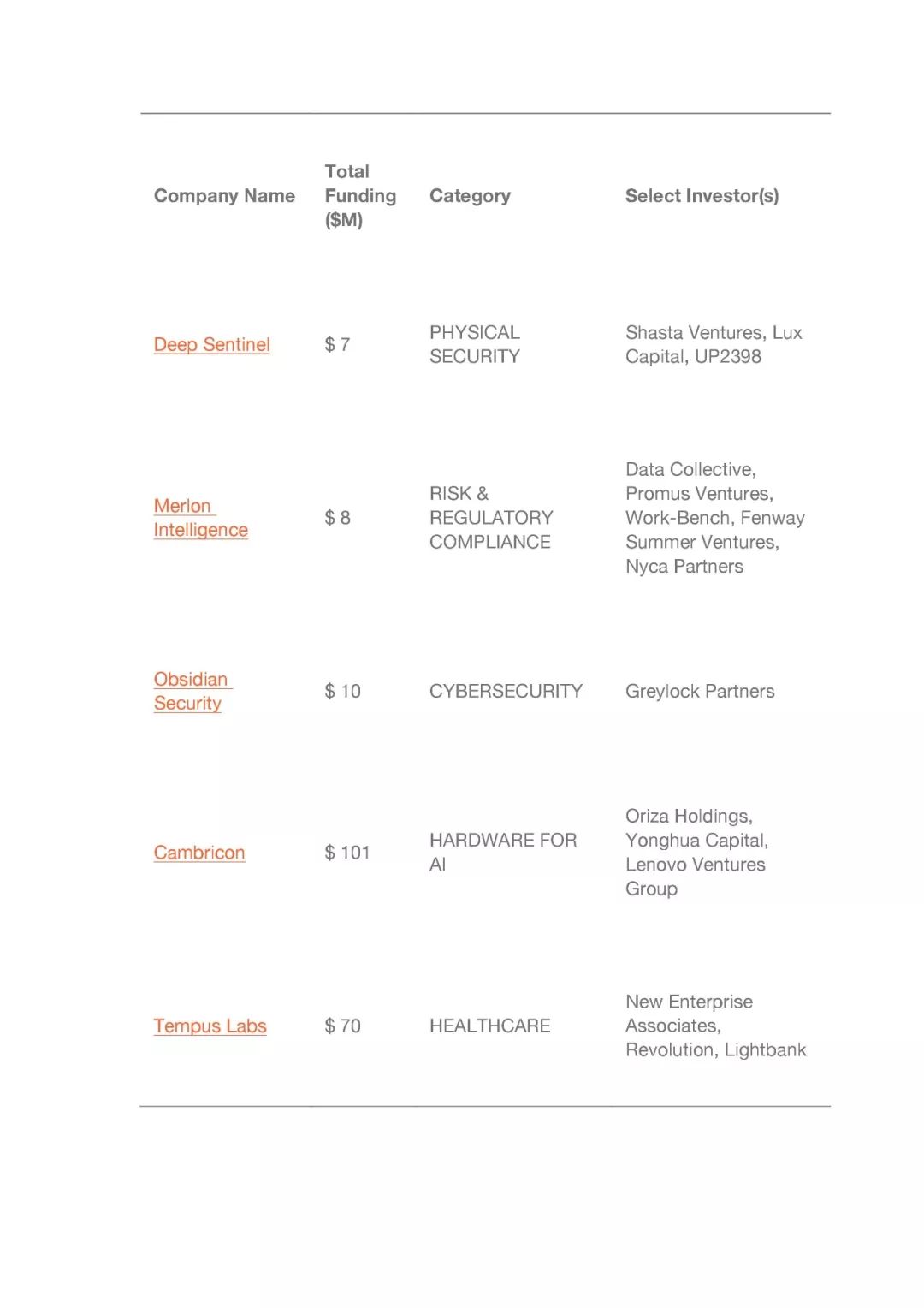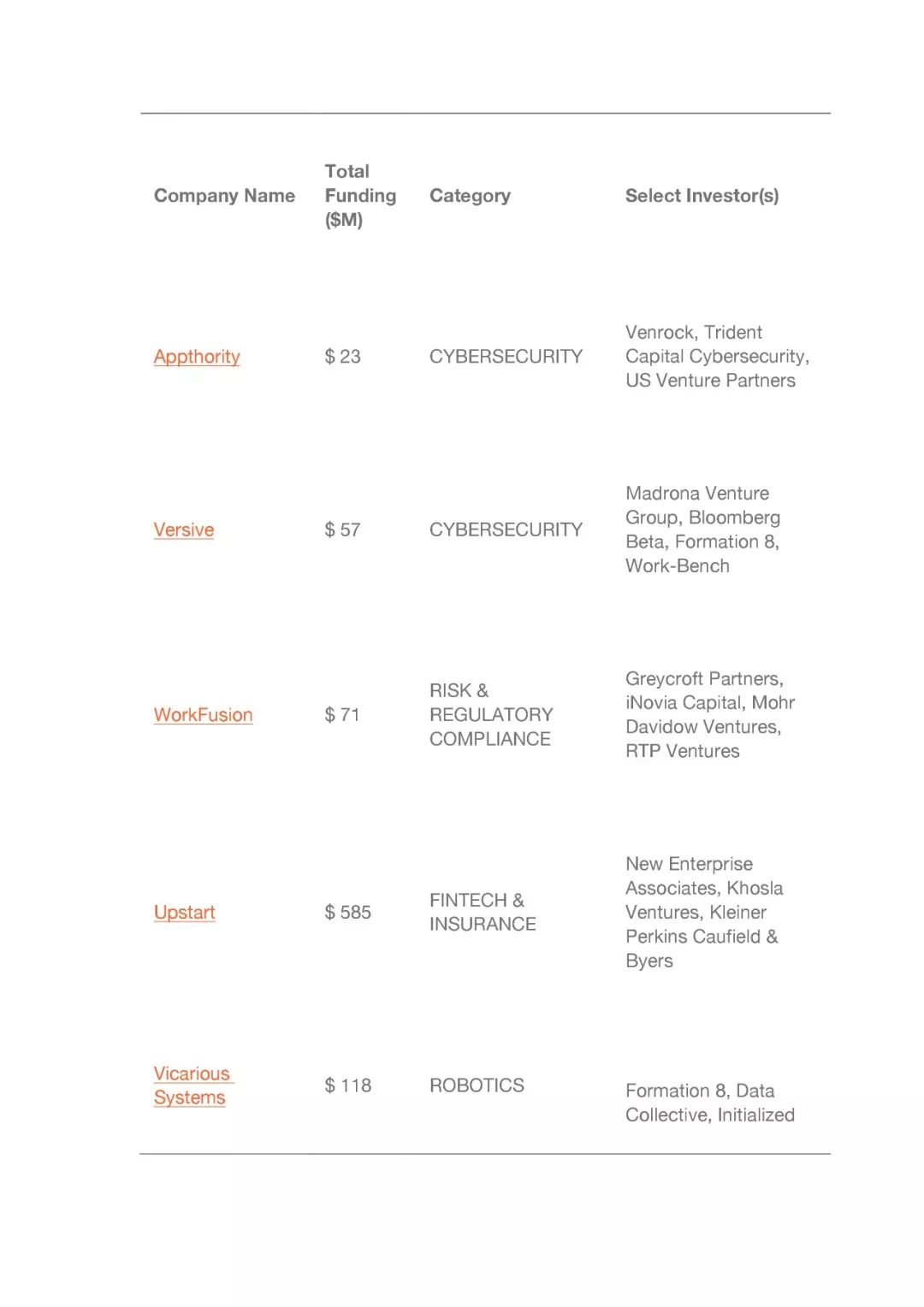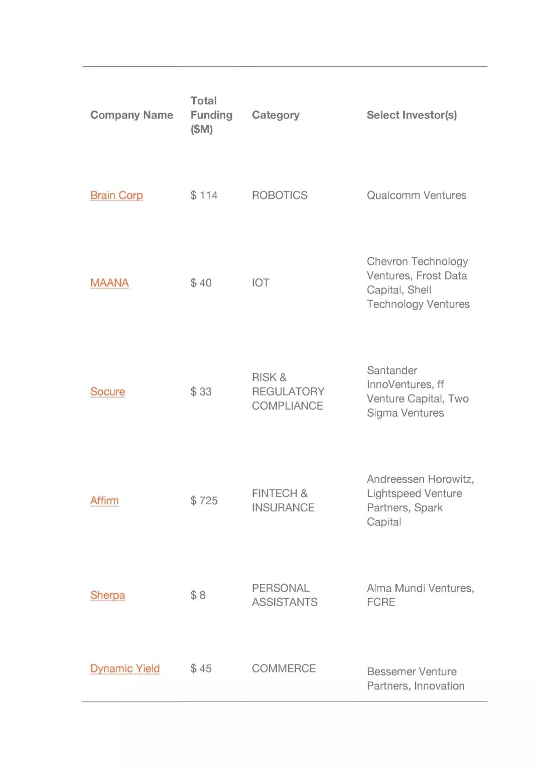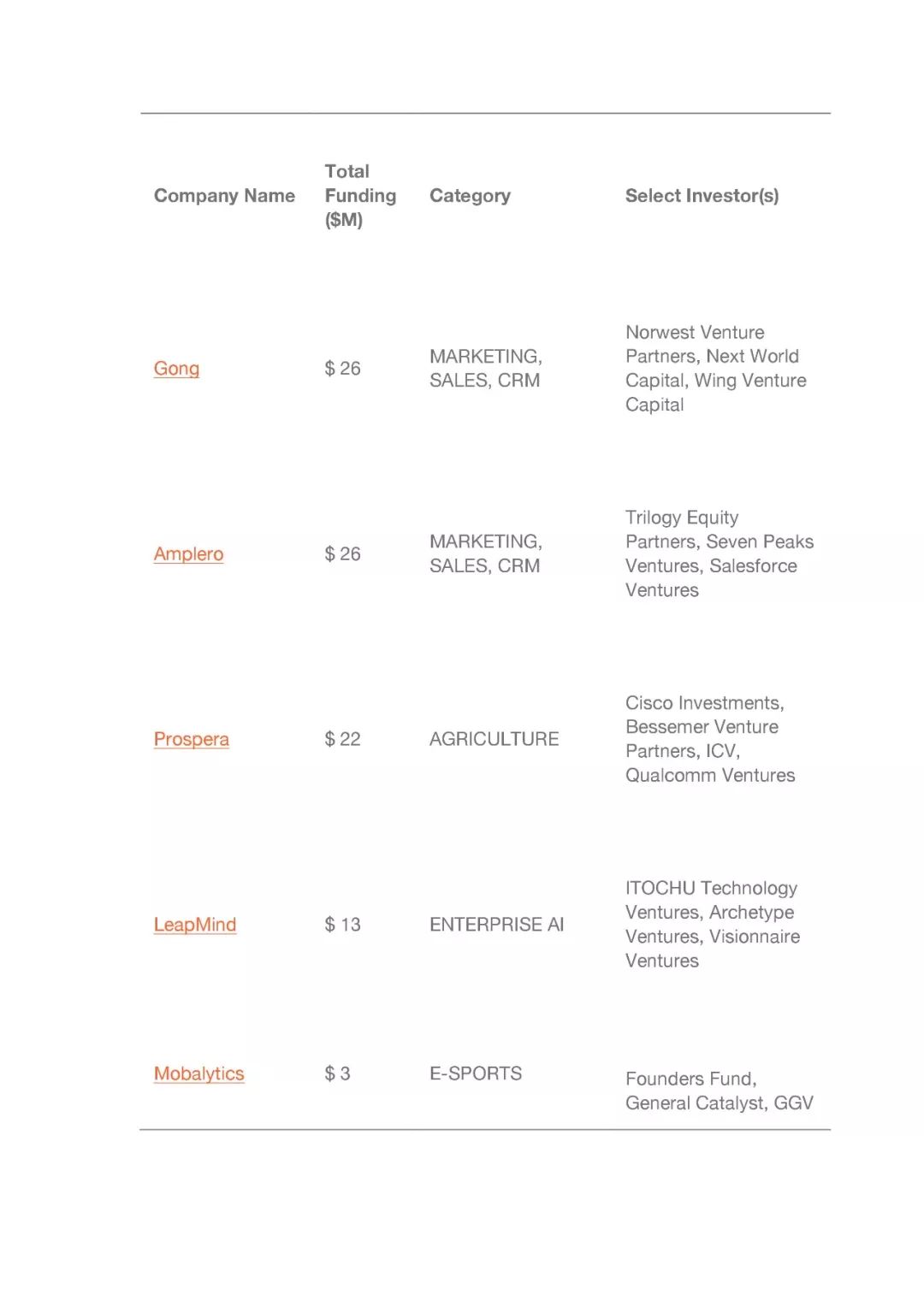 这些创业公司处于不同的研究和融资阶段,从种子/天使(Mobalytics, Text IQ, Merlon Intelligence)到E轮(Affirm, C3IoT, and InsideSales)