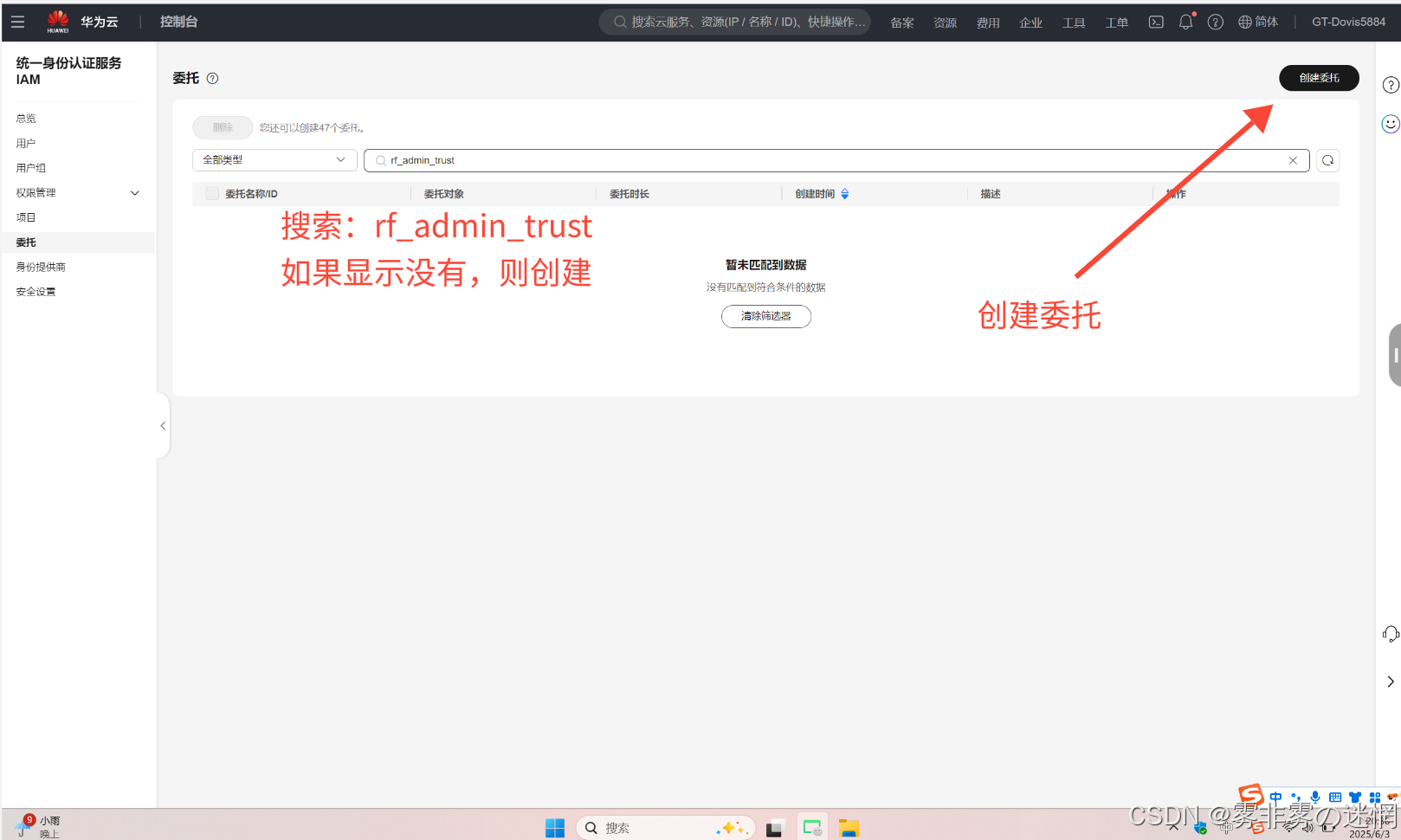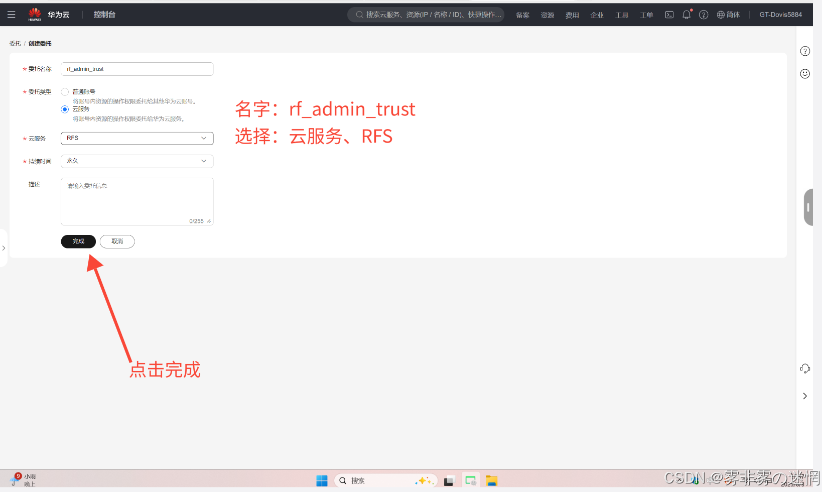 (2)名字设置为:rf_admin_trust,选择云服务,RFS编排,点击完成