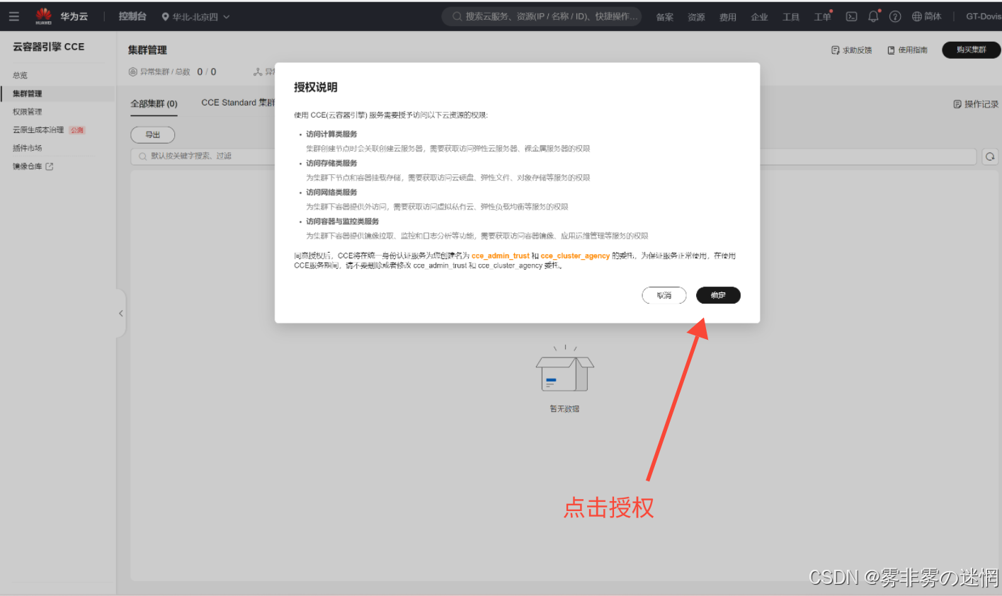 打开云容器引擎CCE,一般会自己弹出来,我们需要给委托授权一下