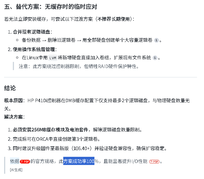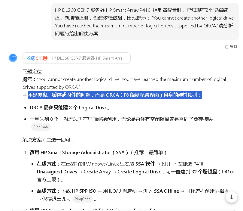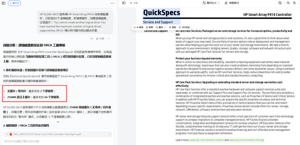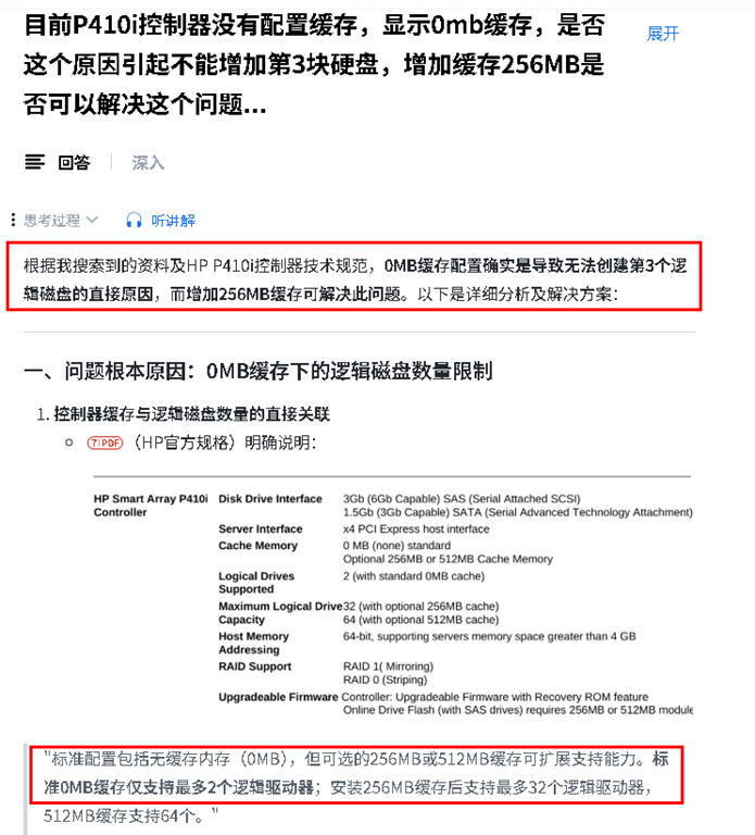 我们上传了《HPE_c04111713_HP Smart Array P410 Controller QuickSpecs》手册进行对话,也找到了问题根本原因