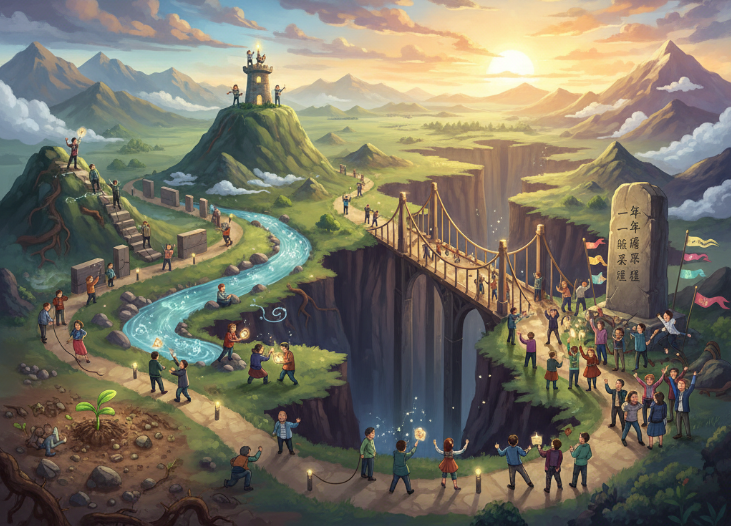 再往前,道路会遇到一个巨大的峡谷。峡谷深邃而宽广,需要搭建一座坚固的桥梁才能通过。建造桥梁的过程是整个旅程中最具挑战性的部分,它需要团队所有成员的智慧、力量和长时间的投入。每个人都在自己的岗位上贡献着,有的在测量,有的在搬运材料,有的则在监督结构。这座桥梁不仅是克服重大挑战的象征,更是团队精诚合作、共同创造的伟大成果。
